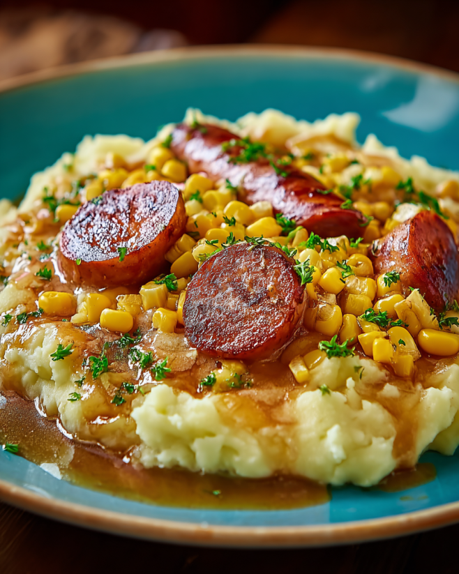Kartoffelpüree mit Wurst, Mais und Käse Rezept genießen!